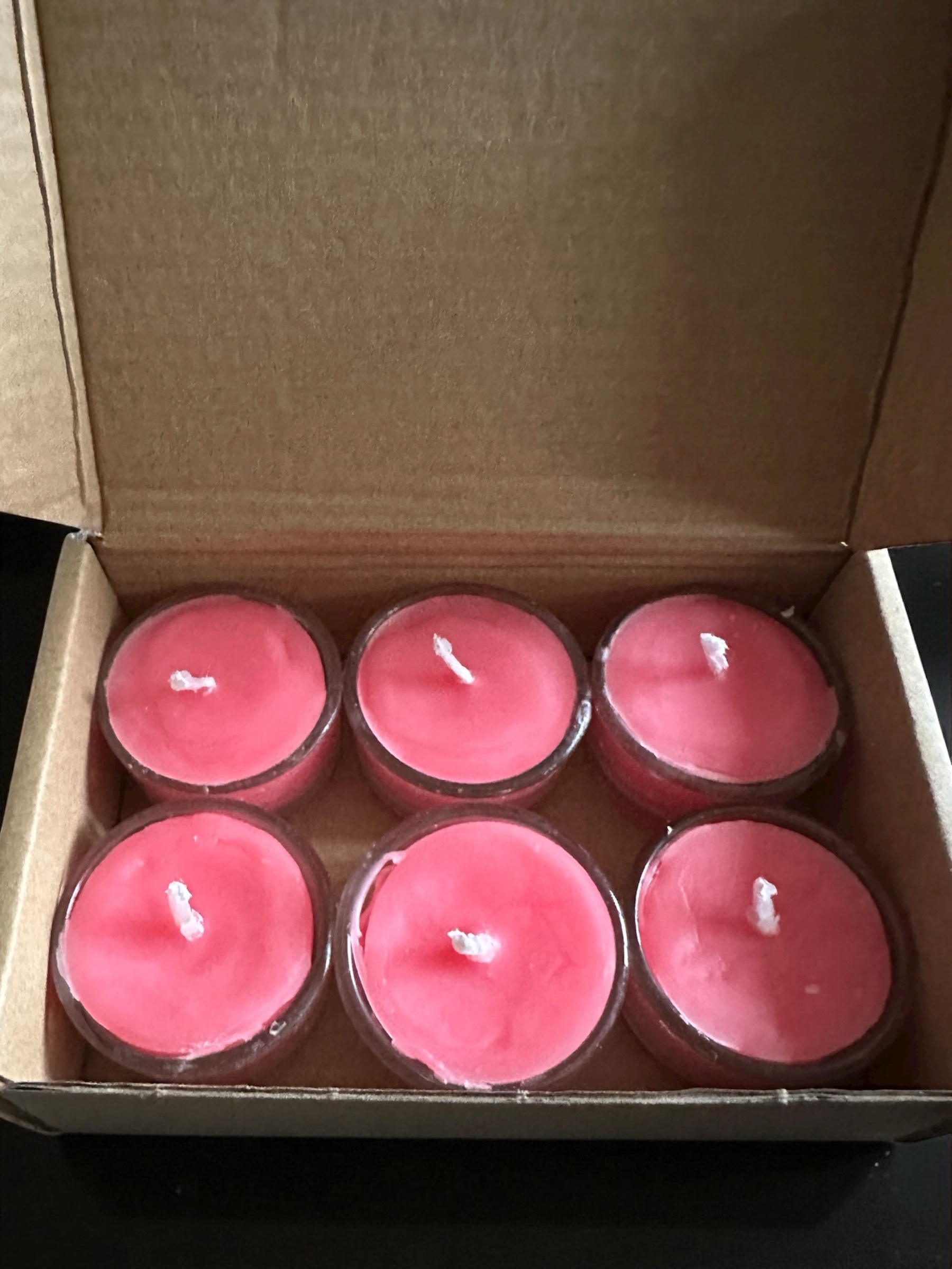 The Tea Lights are made in glass jars that can be recycled and are made with 100% natural beeswax and they come in boxes of 6. They are 2.5 cm x 4.5 cm each.