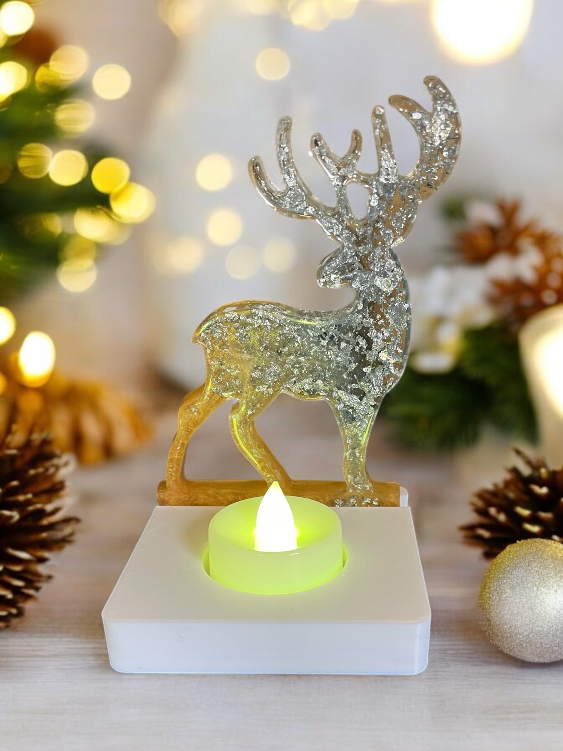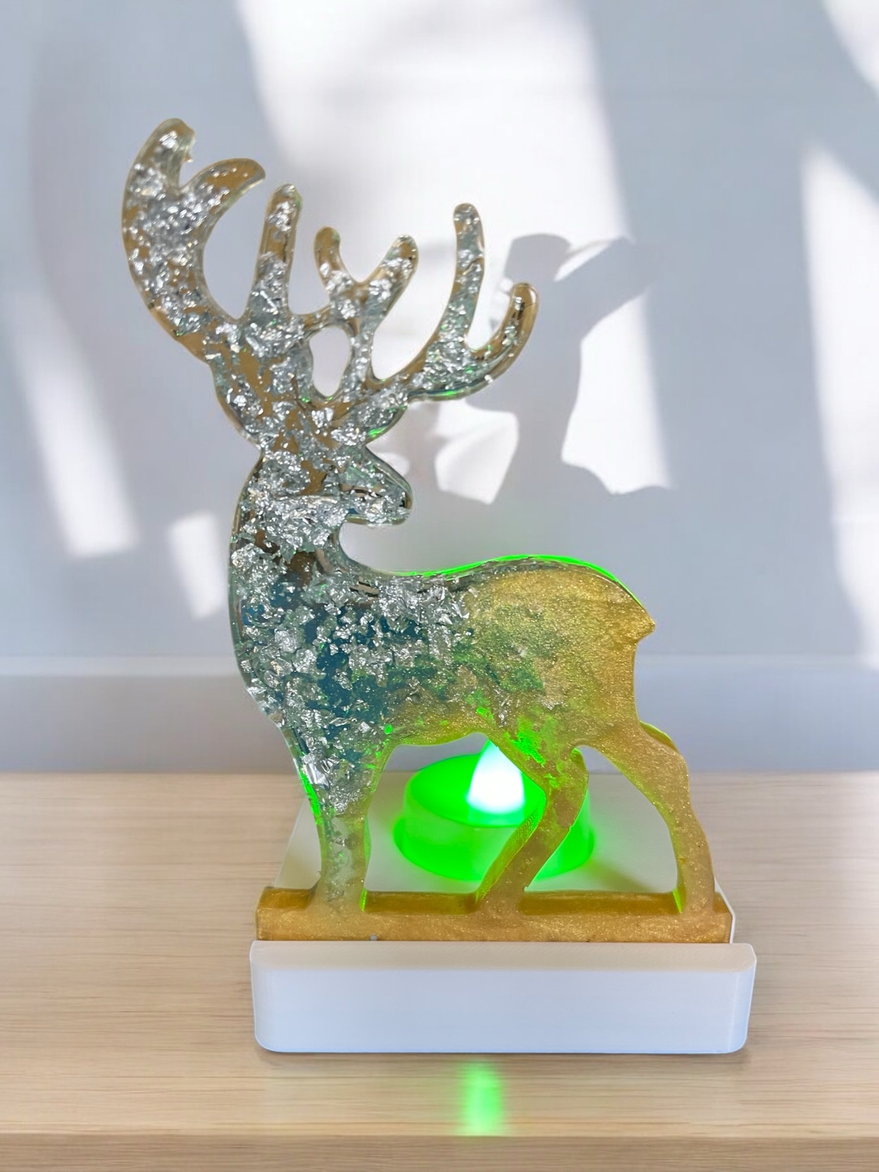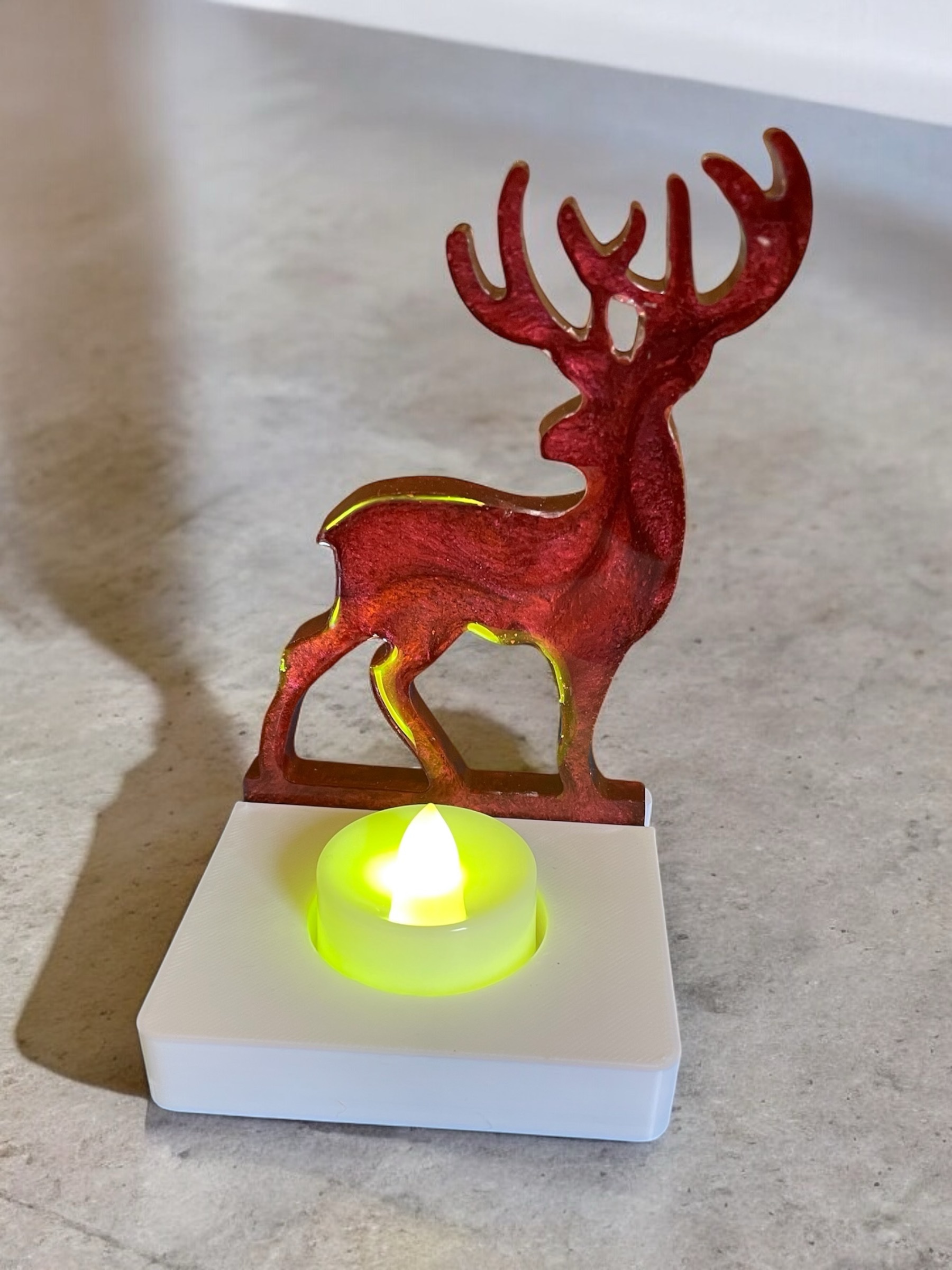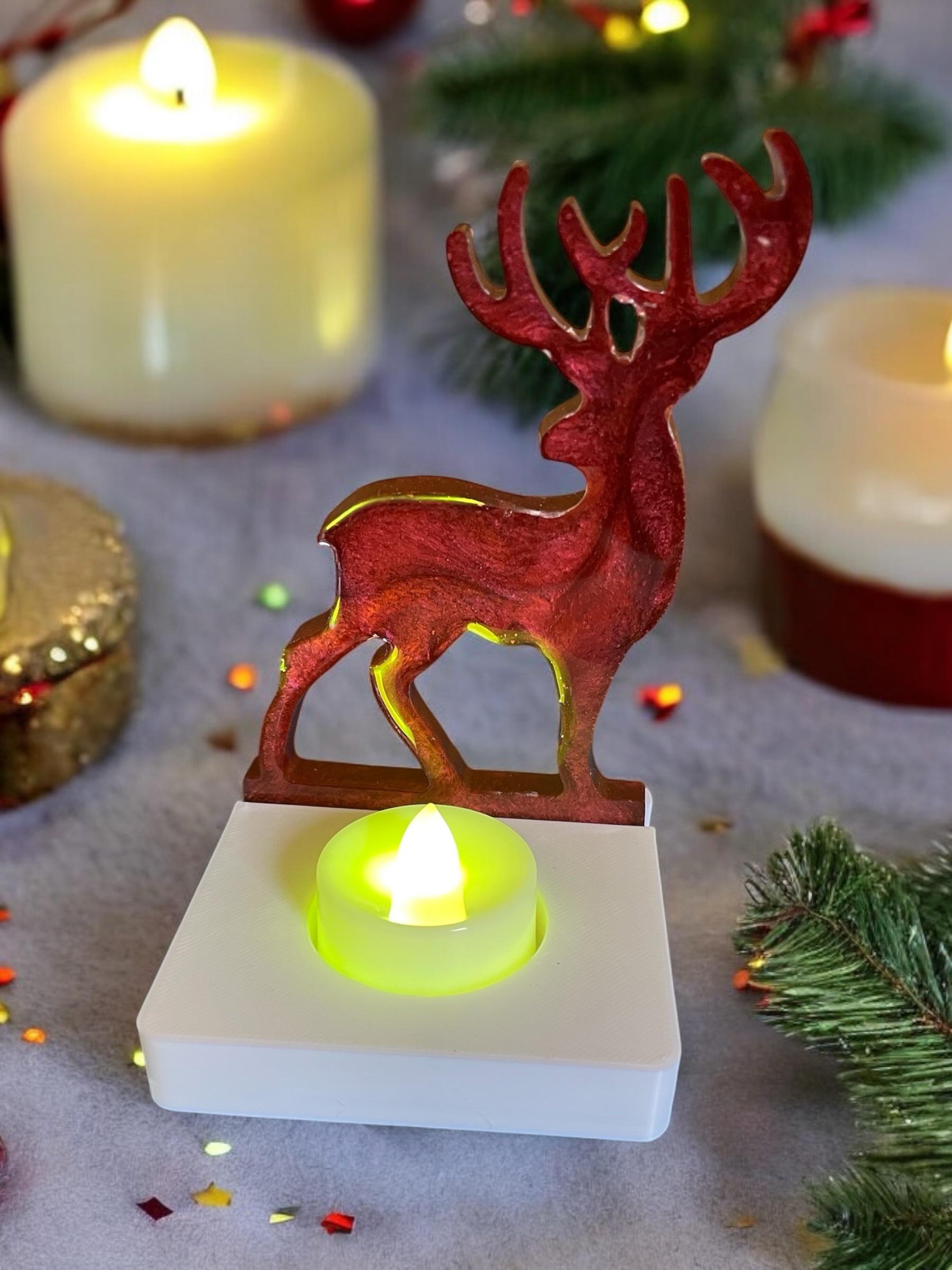 Handmade resin reindeer tea light holder. It is Also available in different colours just note your requirements when ordering. The tea lights are available in white or multi coloured.