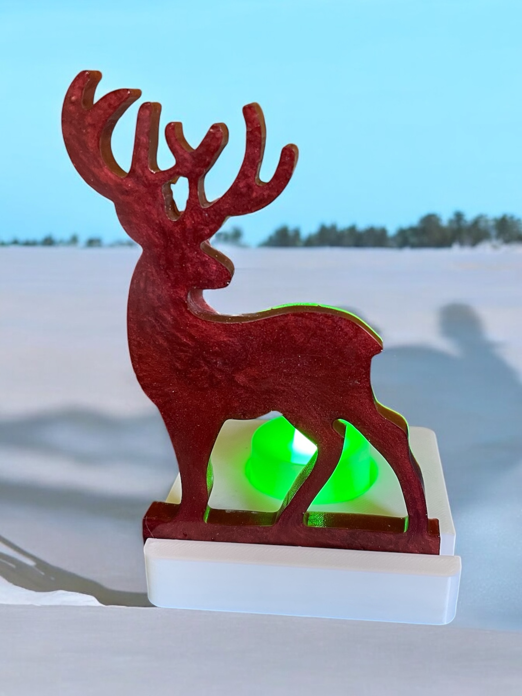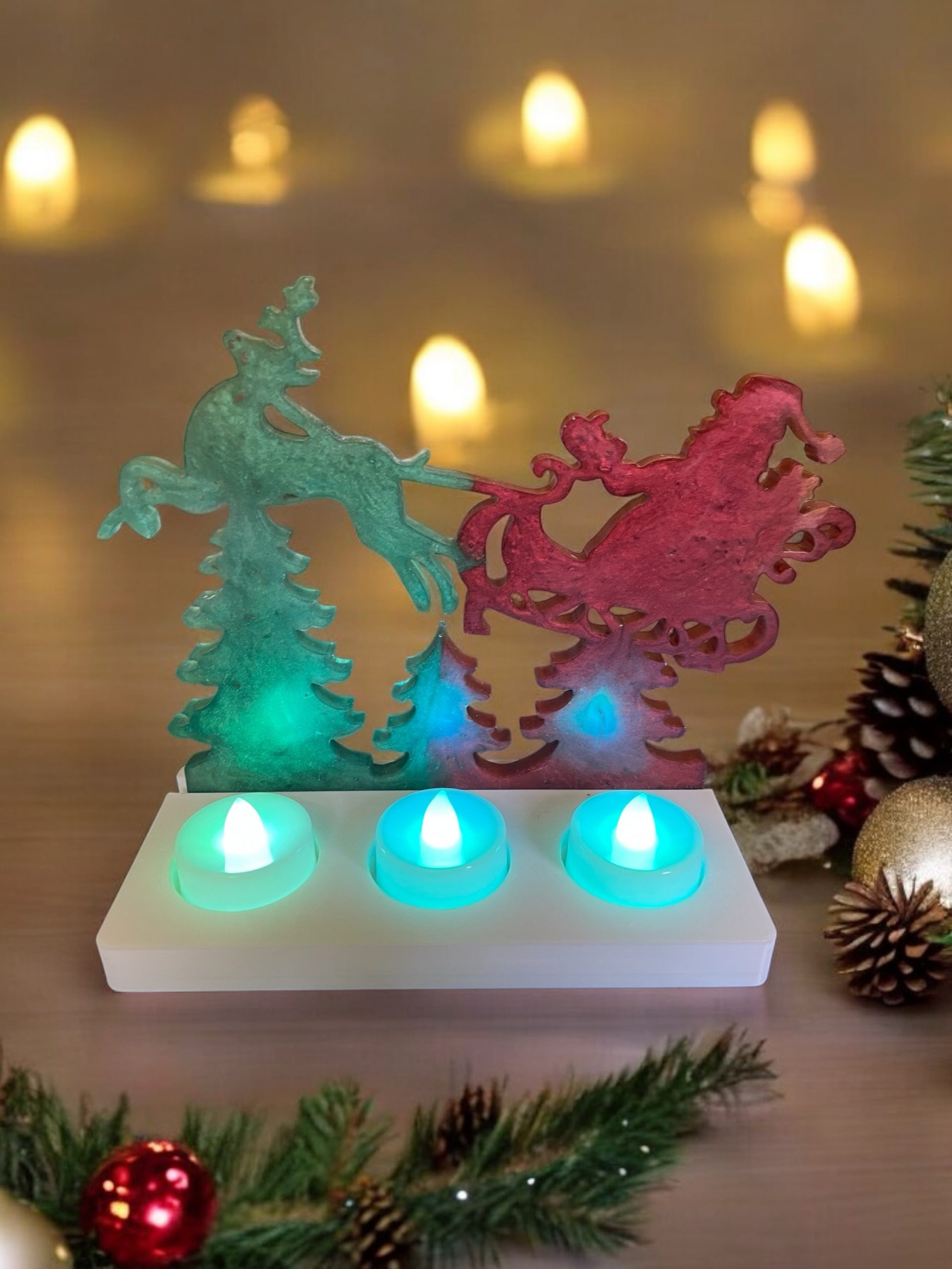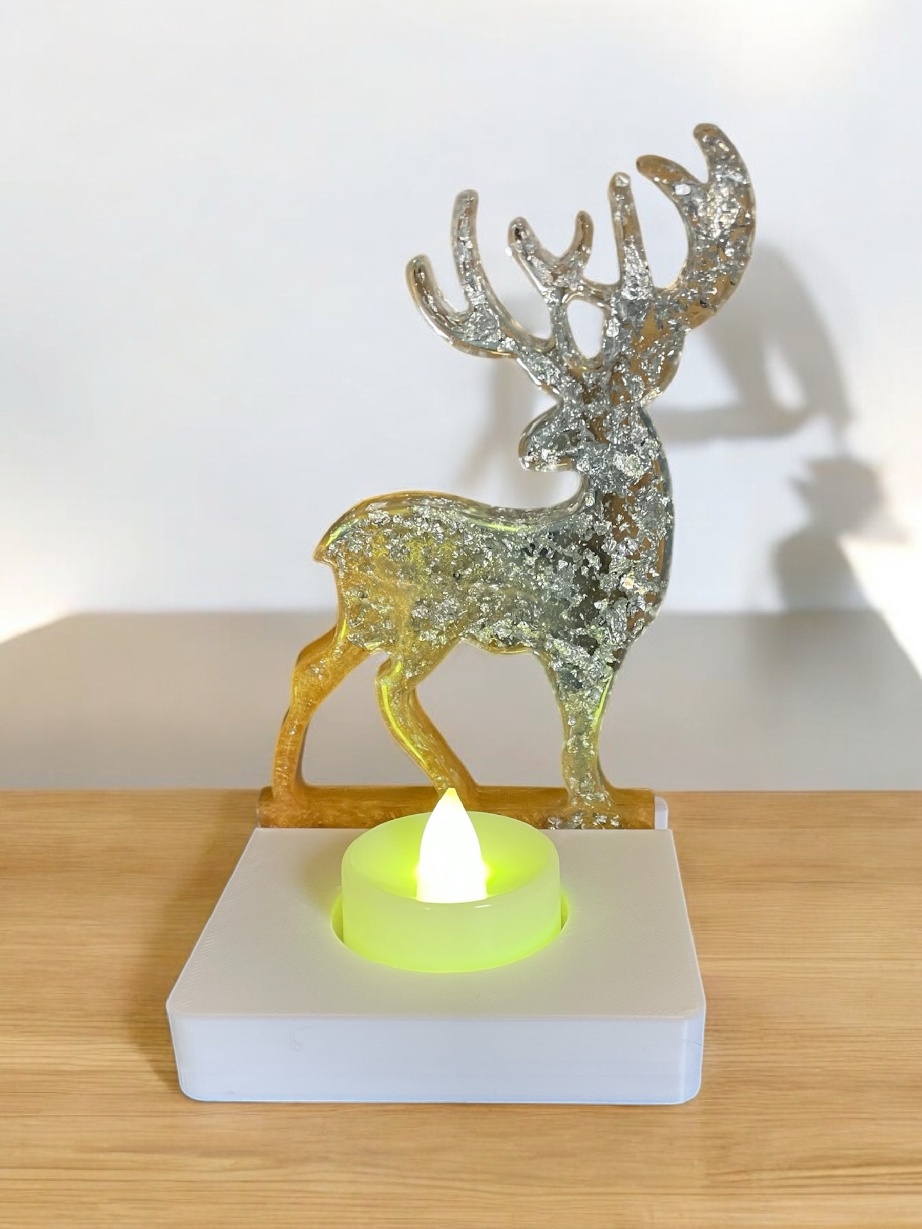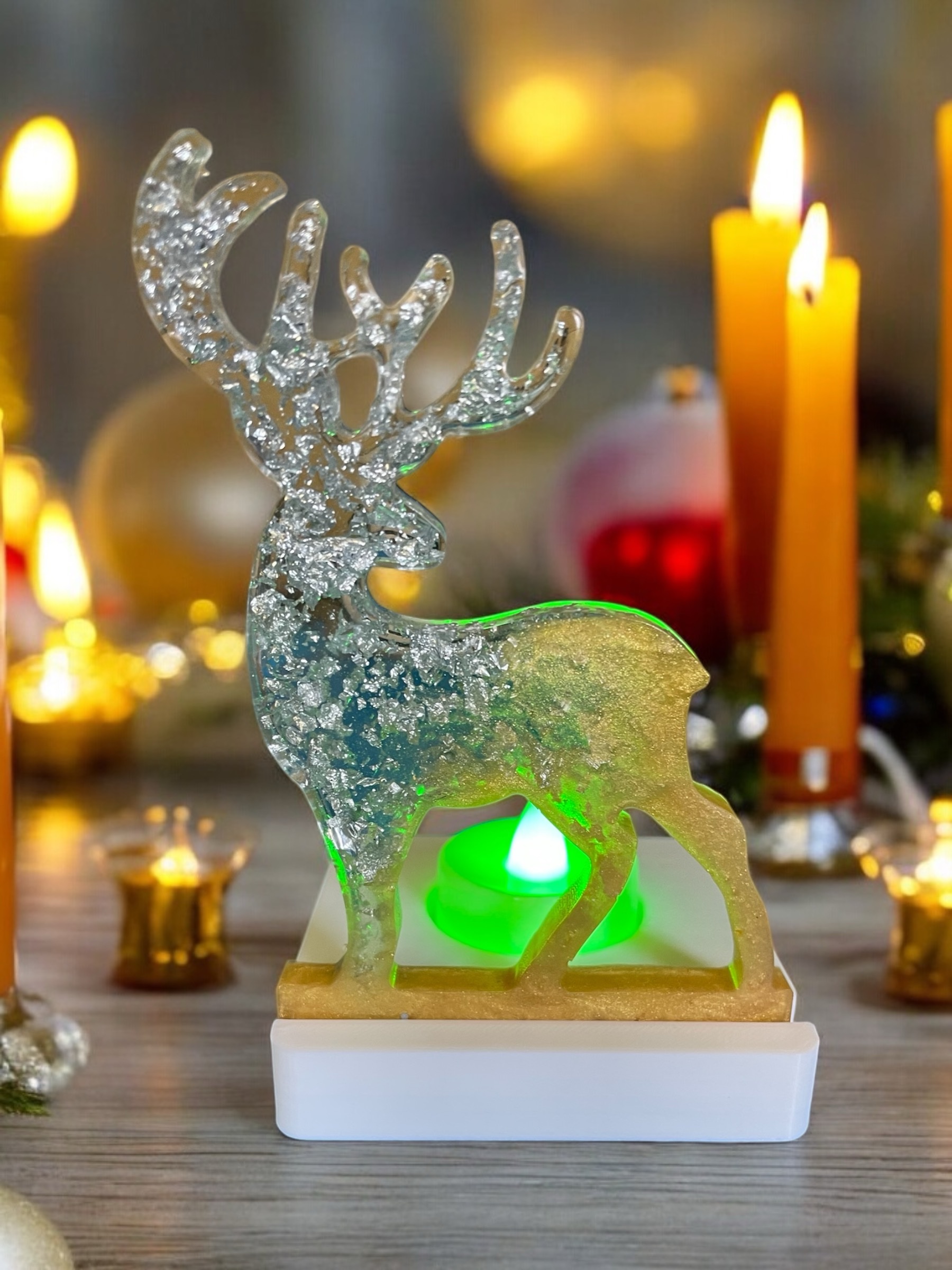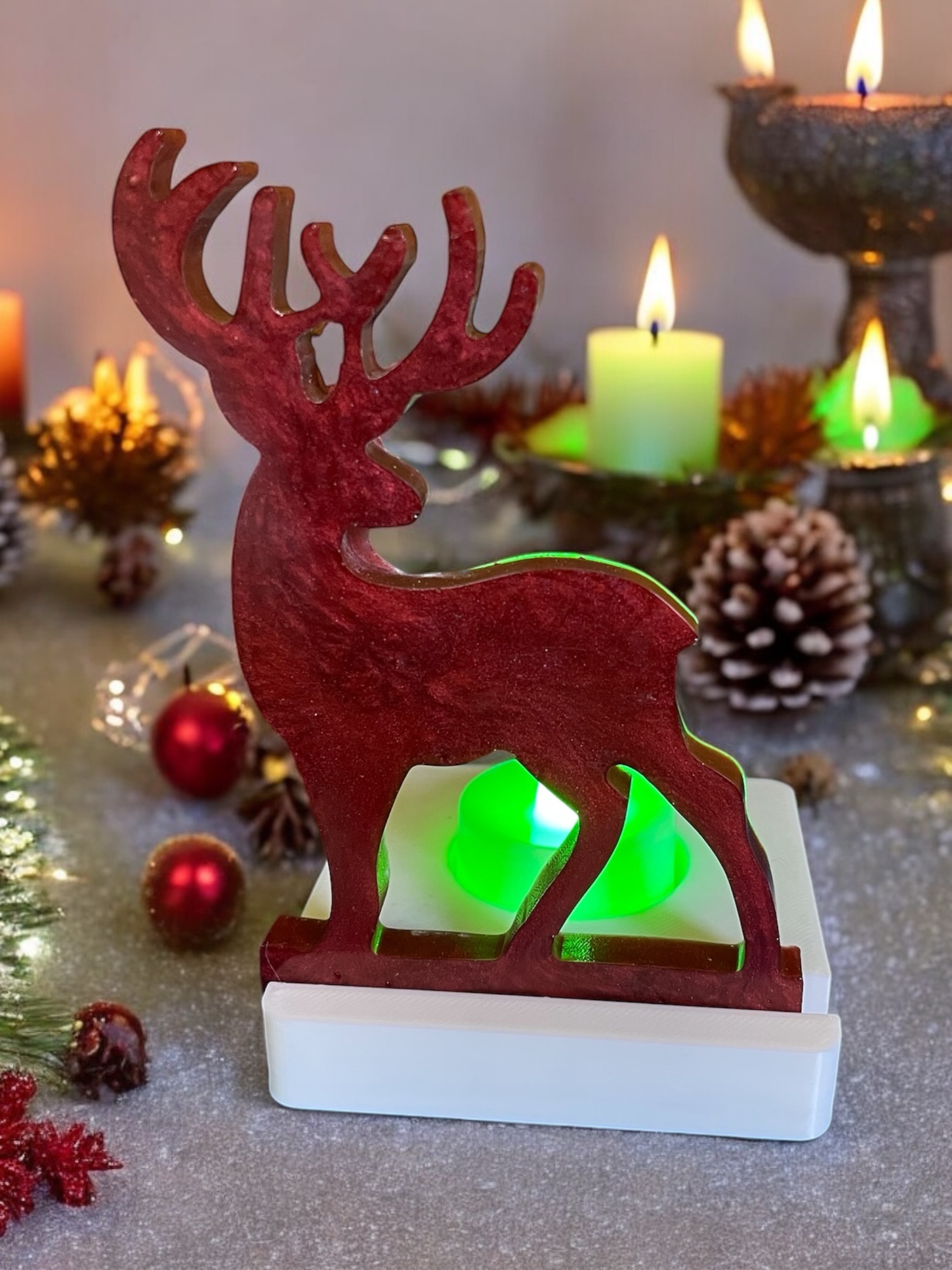 Handmade resin reindeer tea light holder. It is Also available in different colours just note your requirements when ordering. The tea lights are available in white or multi coloured.