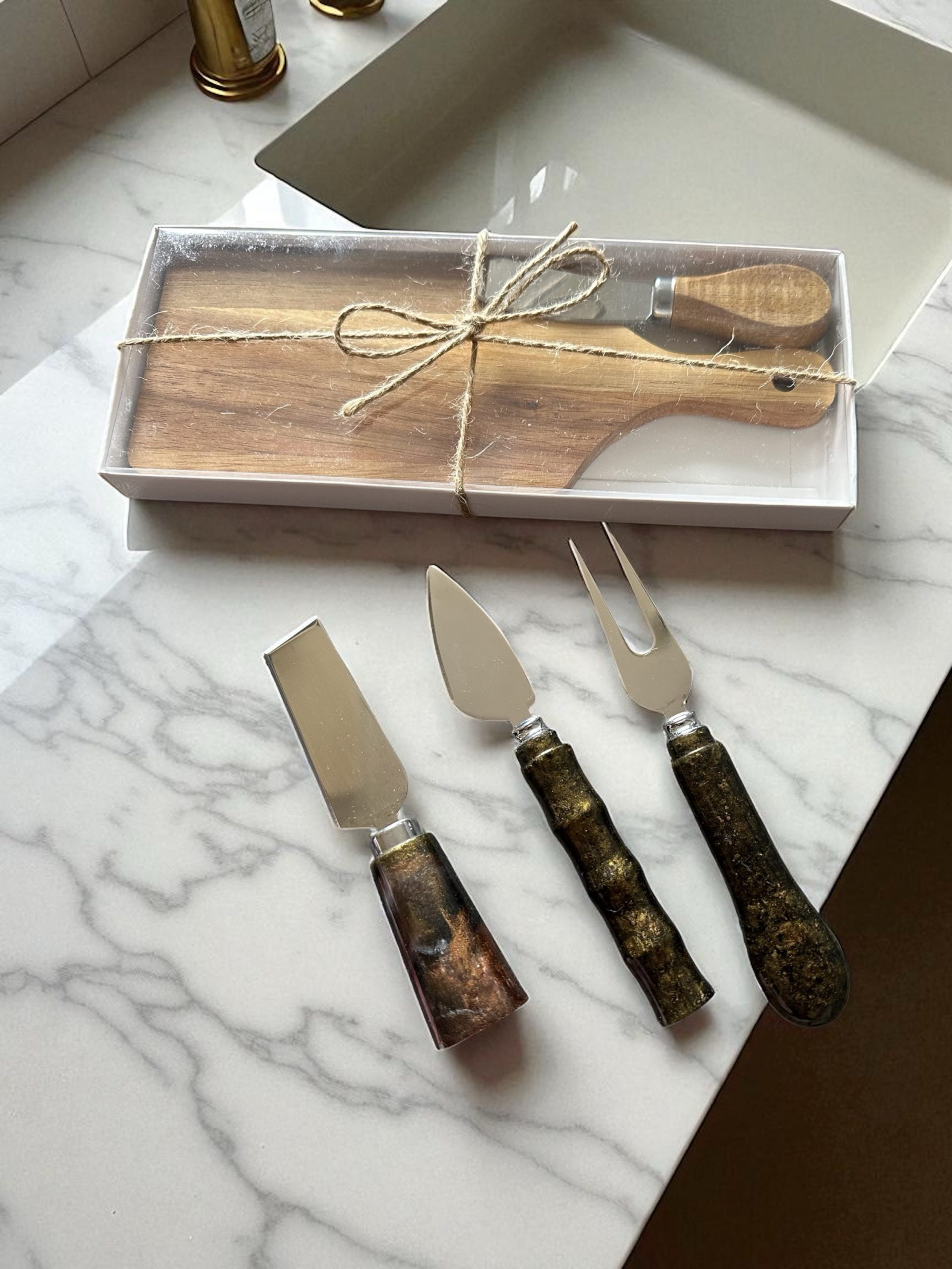 The set includes a handmade Acacia wood cheese board with a handmade butter knife with a stainless steel blade and 3 stainless steel cheese blades including a fork with handmade resin handles.