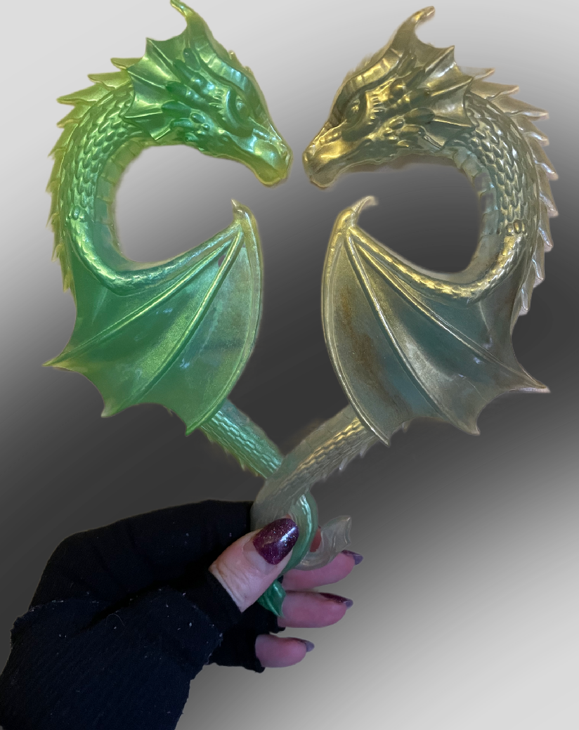 The double heart shaped dragons measure 17.7 cm wide x 22 cm high.