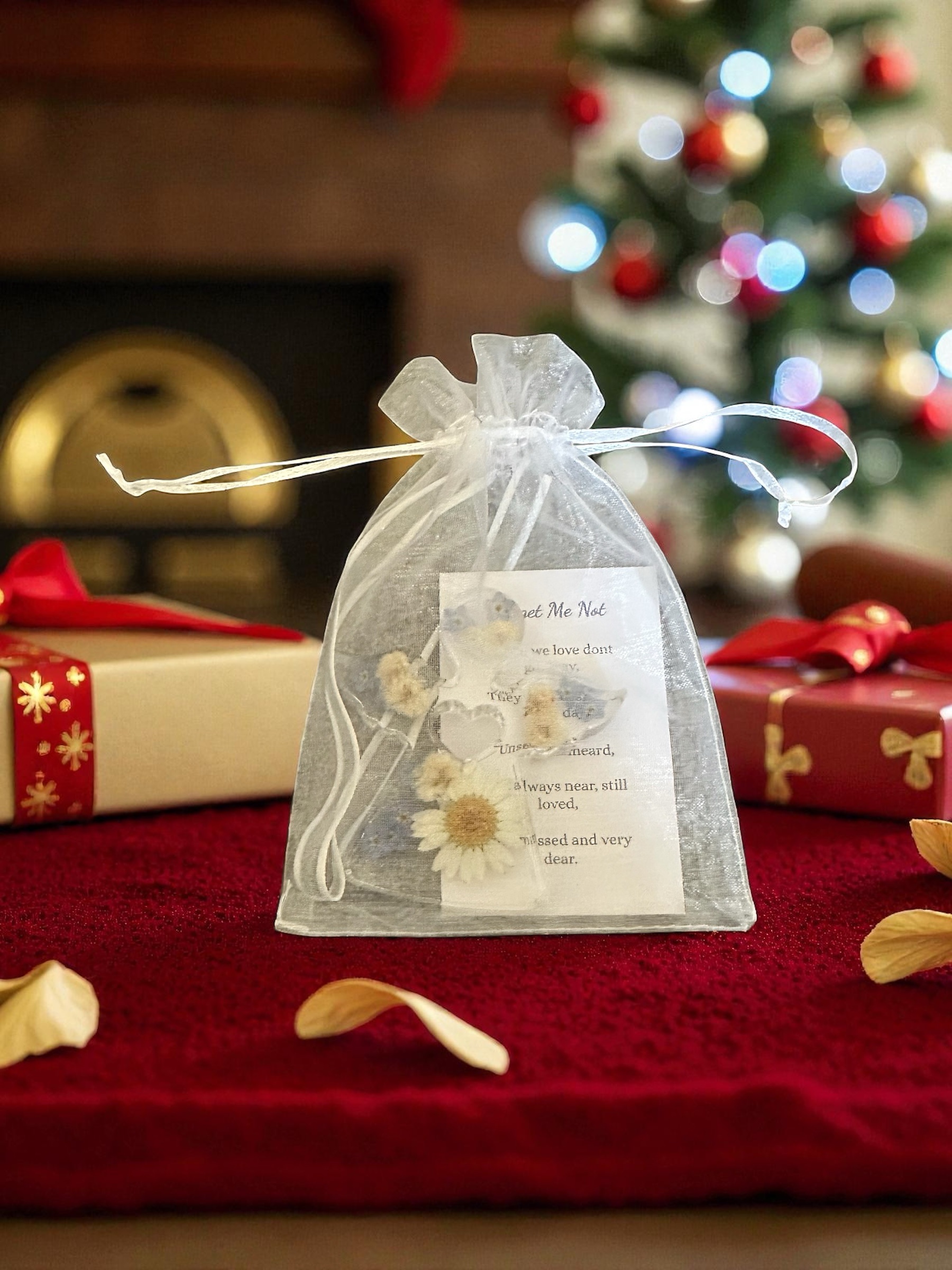 The angel comes with embedded flowers including forget me nots. It has a ribbon included in case you want to hang it up as-well as a memorial poem and comes in an organza bag.