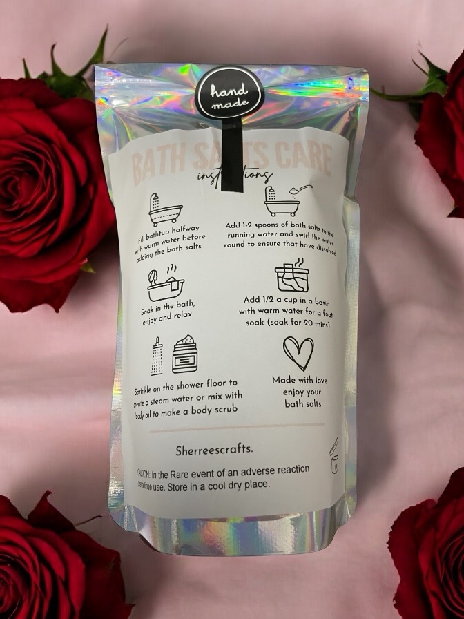 Handmade bath salts with Lavender, Relaxing Embrace & Sleep Fragrances with dried flowers & Mica Colouring.