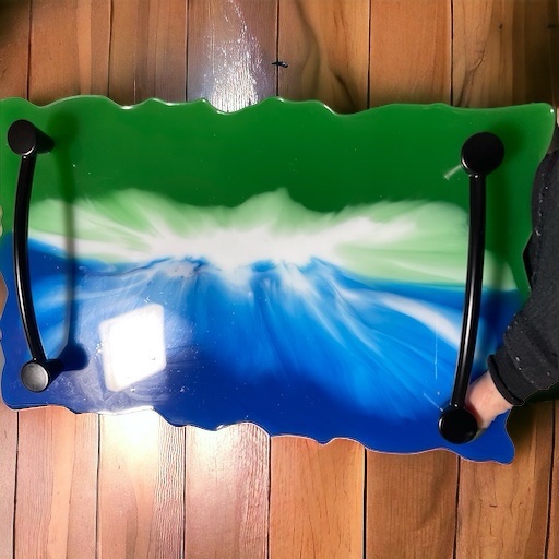 They measure 30 cm x 19 cm approx and have metal or resin handles and can have indented coasters in desired.